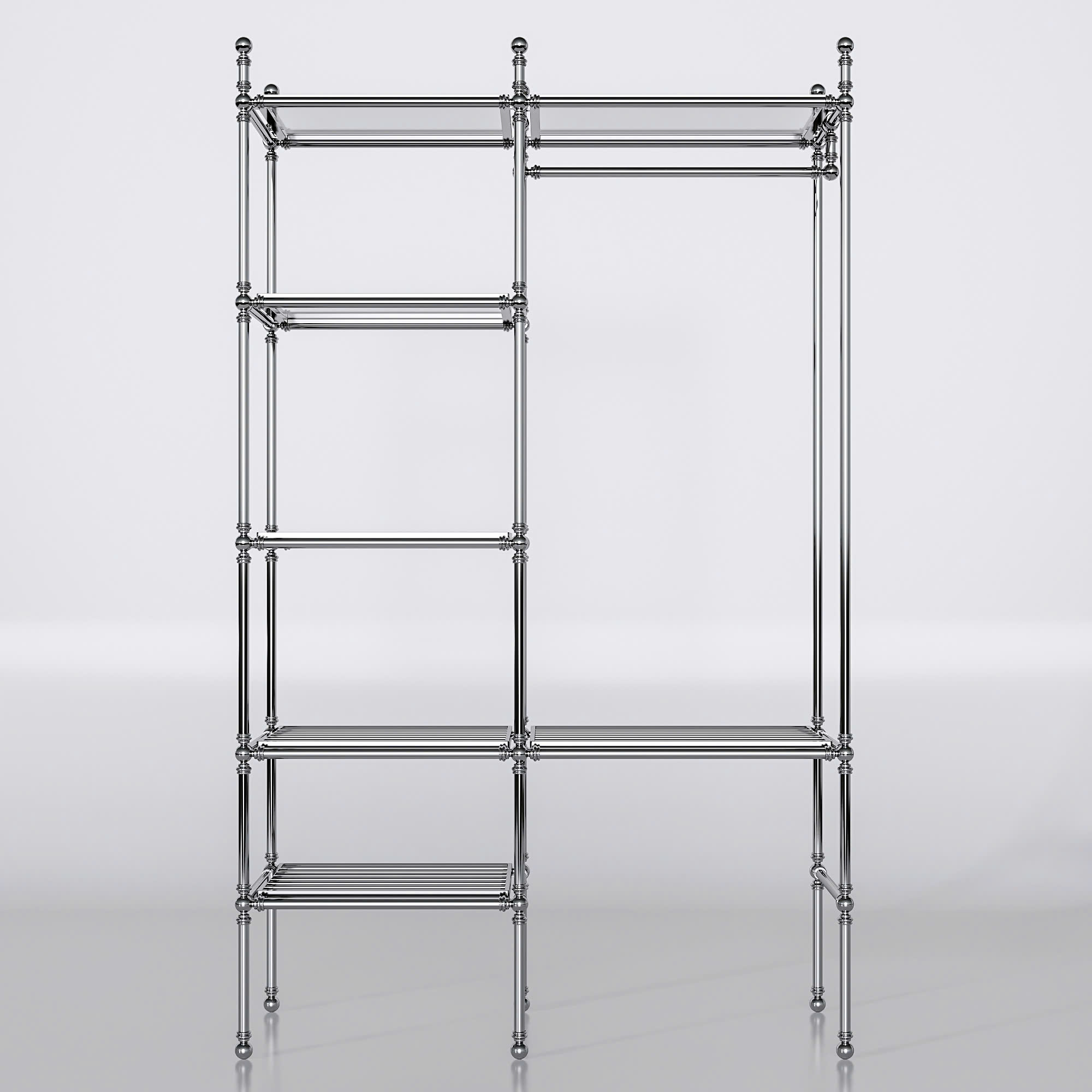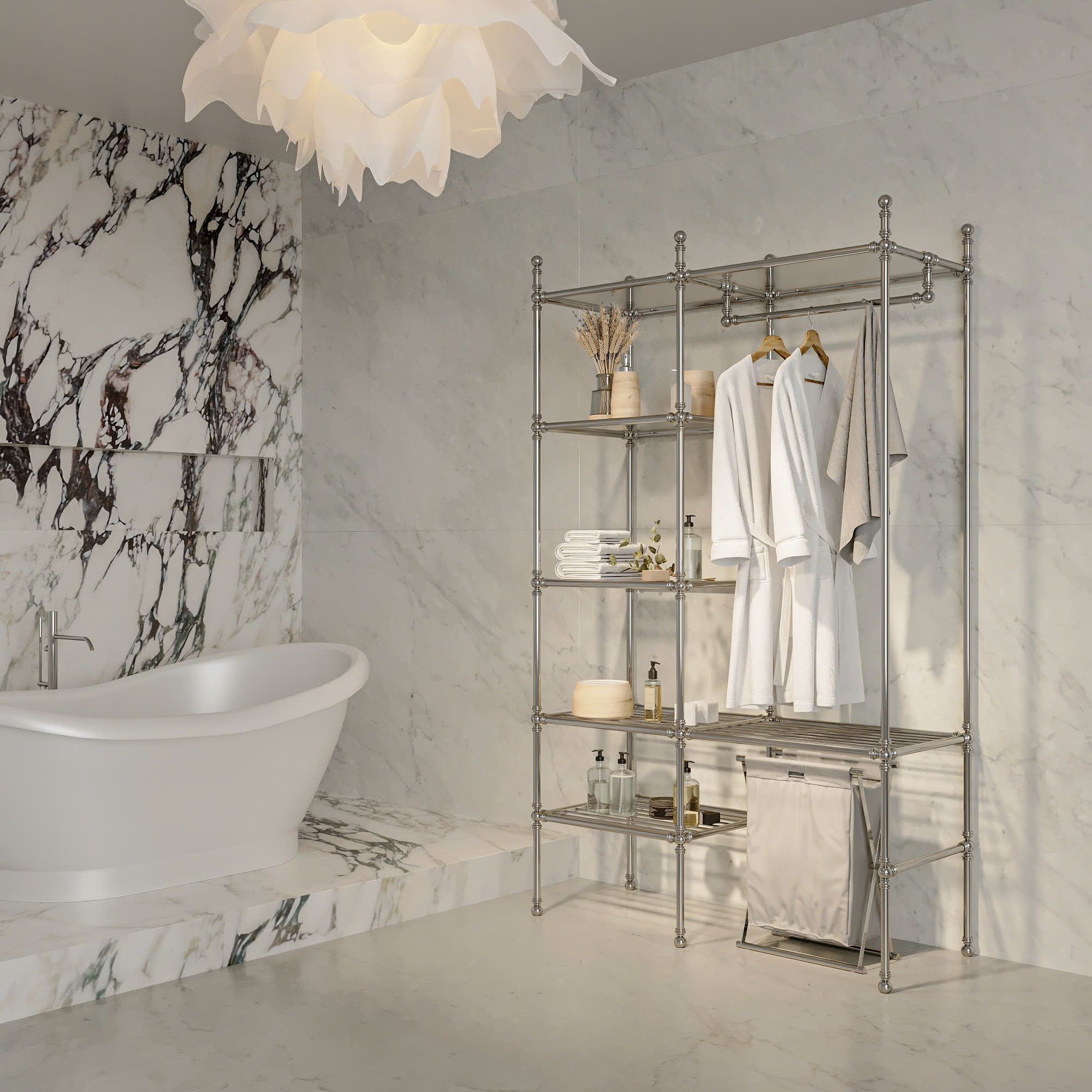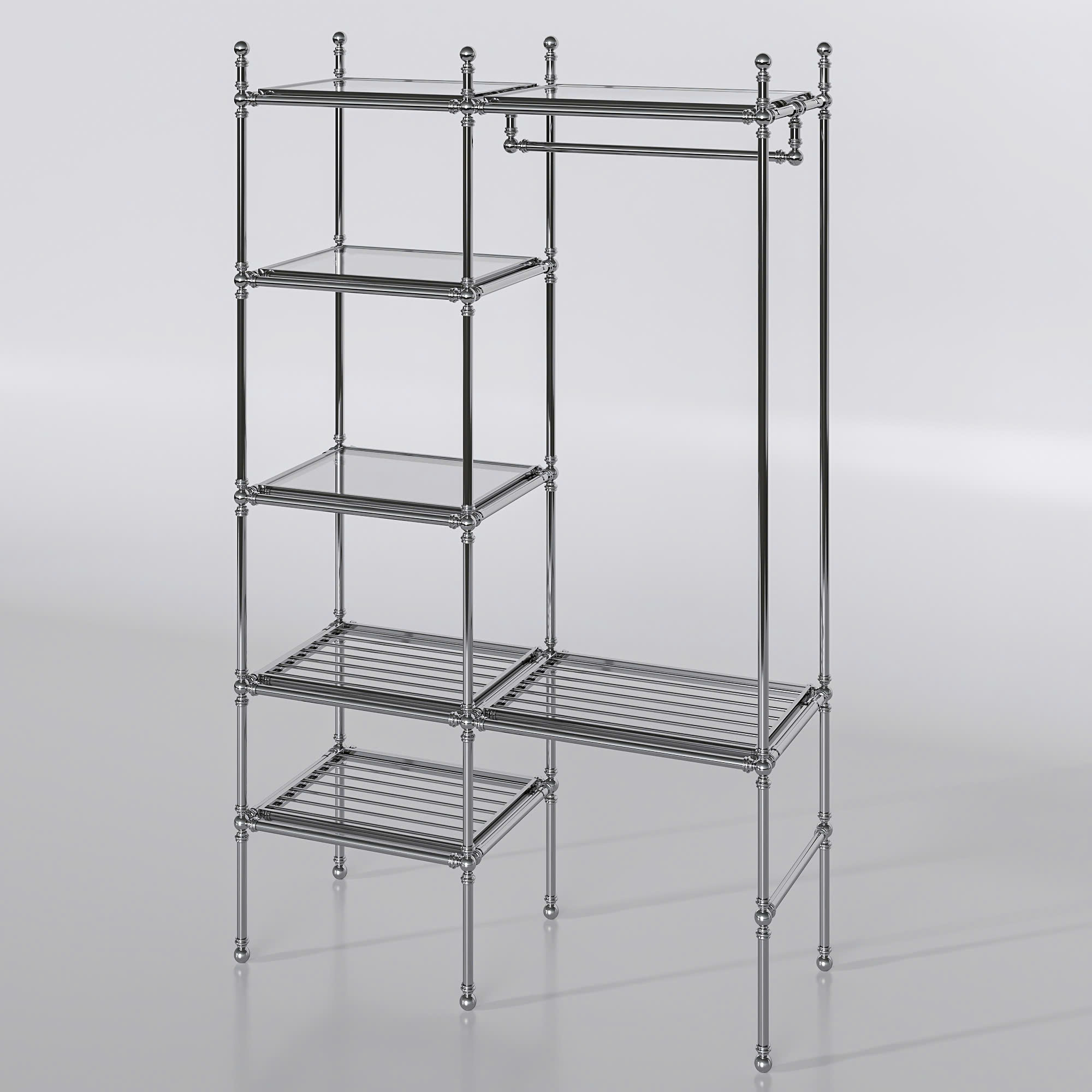 Một chiếc kệ trưng bày bằng kim loại với thiết kế đơn giản và hiện đại. Kệ có nhiều tầng để đặt đồ như khăn, chai lọ, vật dụng trang trí, đồng thời có thanh treo để treo quần áo hoặc áo choàng. Tổng thể kệ gọn gàng, chắc chắn và phù hợp để sử dụng trong phòng tắm hoặc phòng thay đồ, giúp không gian ngăn nắp và đẹp mắt hơn.