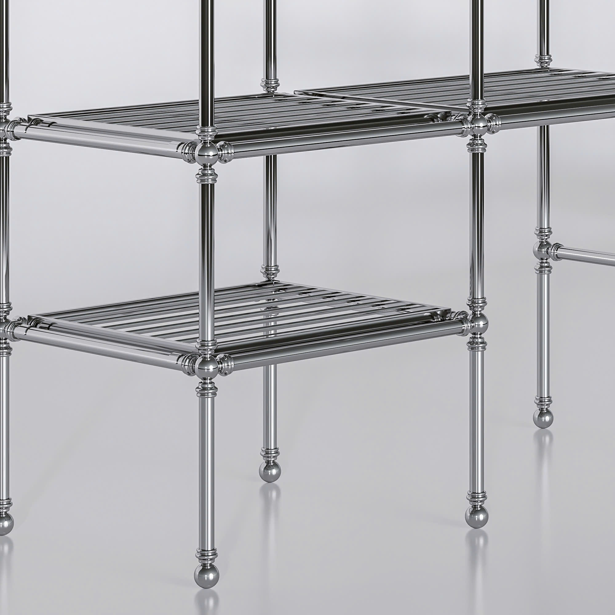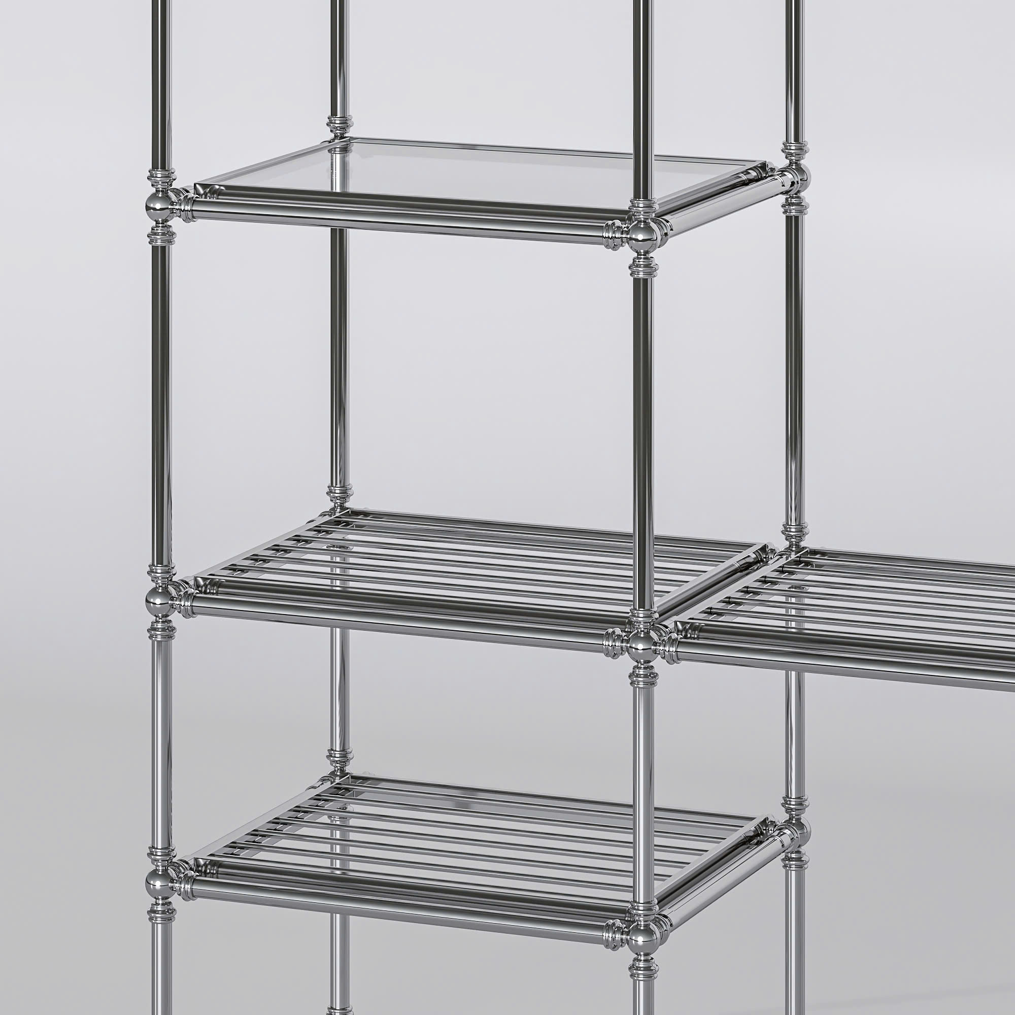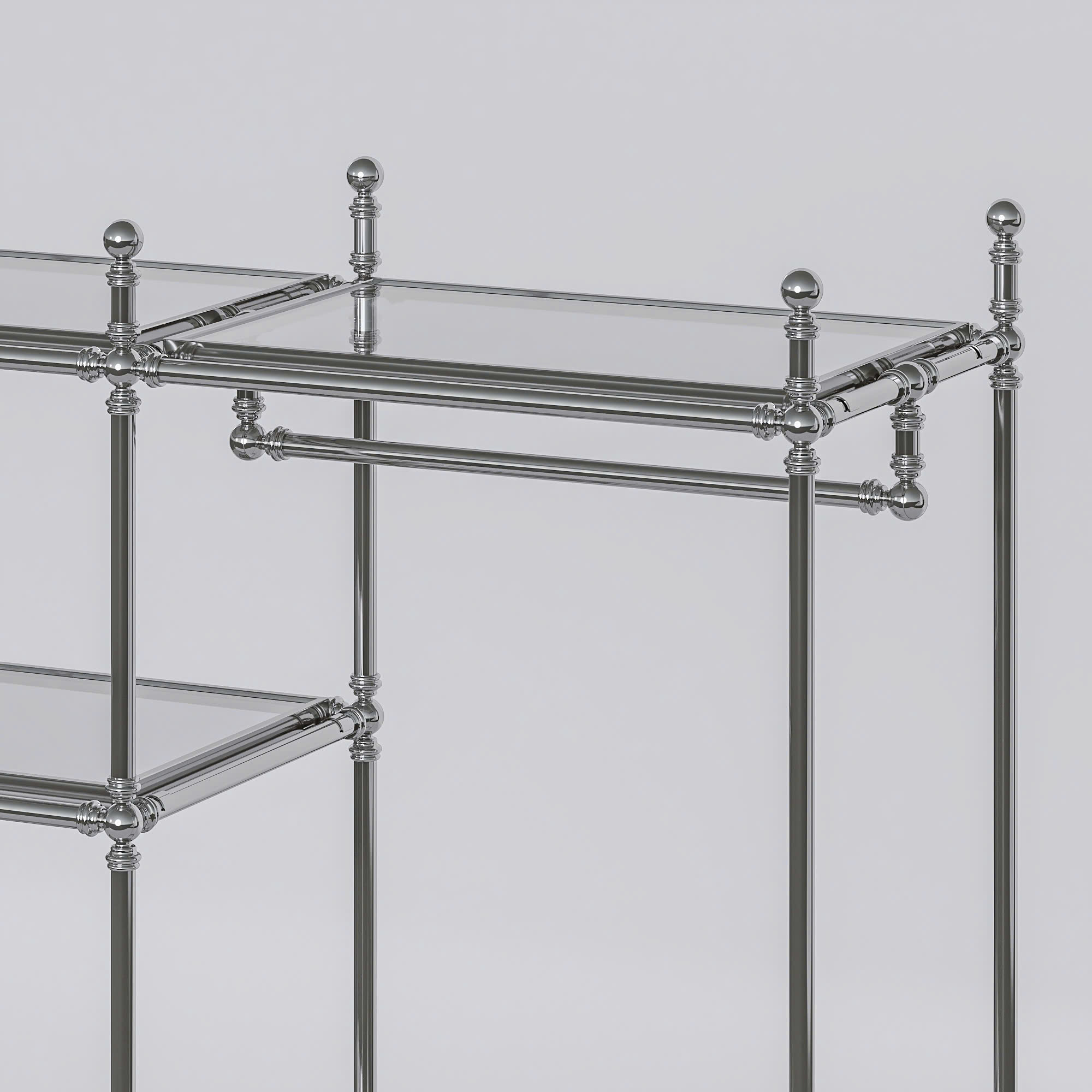 Một chiếc kệ trưng bày bằng kim loại với thiết kế đơn giản và hiện đại. Kệ có nhiều tầng để đặt đồ như khăn, chai lọ, vật dụng trang trí, đồng thời có thanh treo để treo quần áo hoặc áo choàng. Tổng thể kệ gọn gàng, chắc chắn và phù hợp để sử dụng trong phòng tắm hoặc phòng thay đồ, giúp không gian ngăn nắp và đẹp mắt hơn.