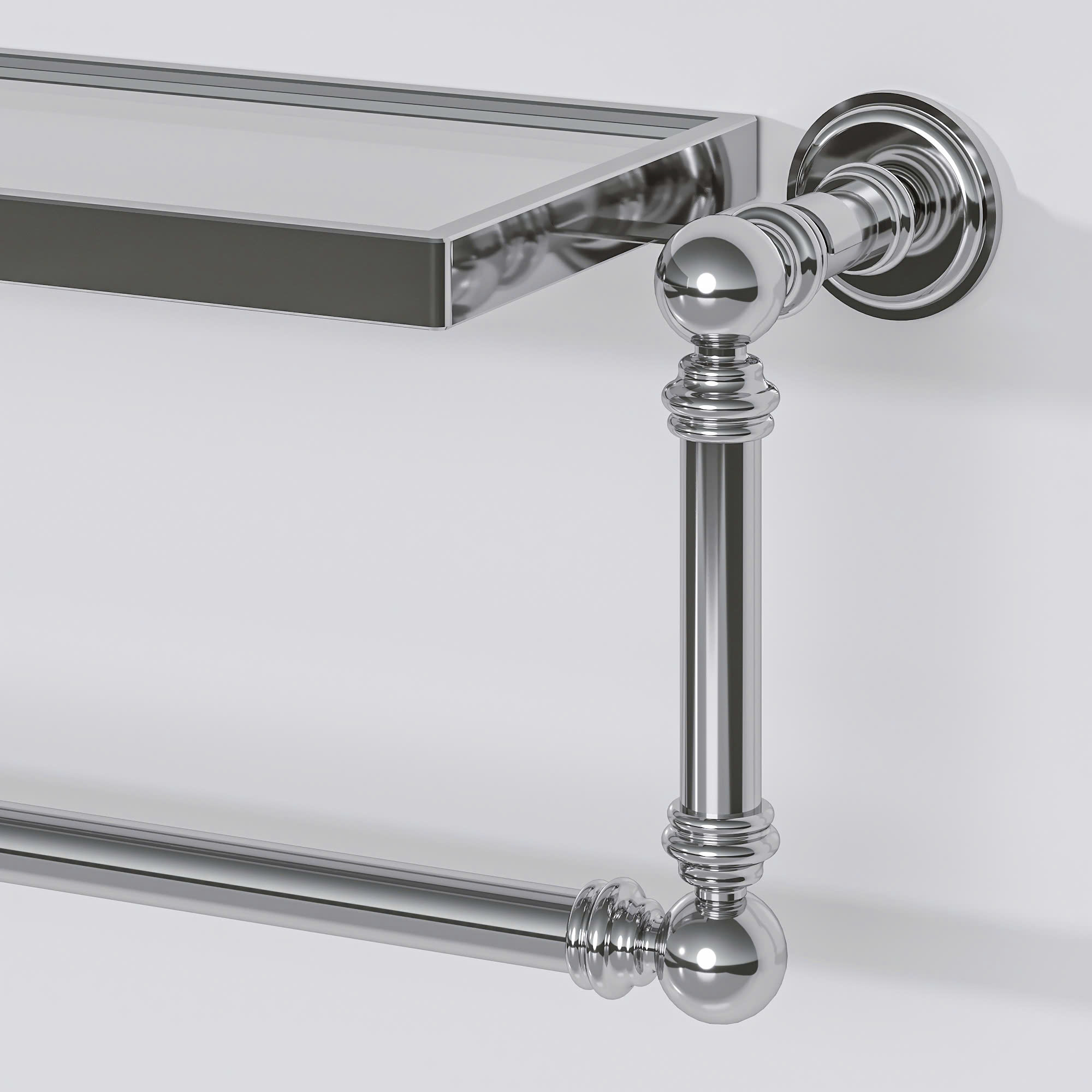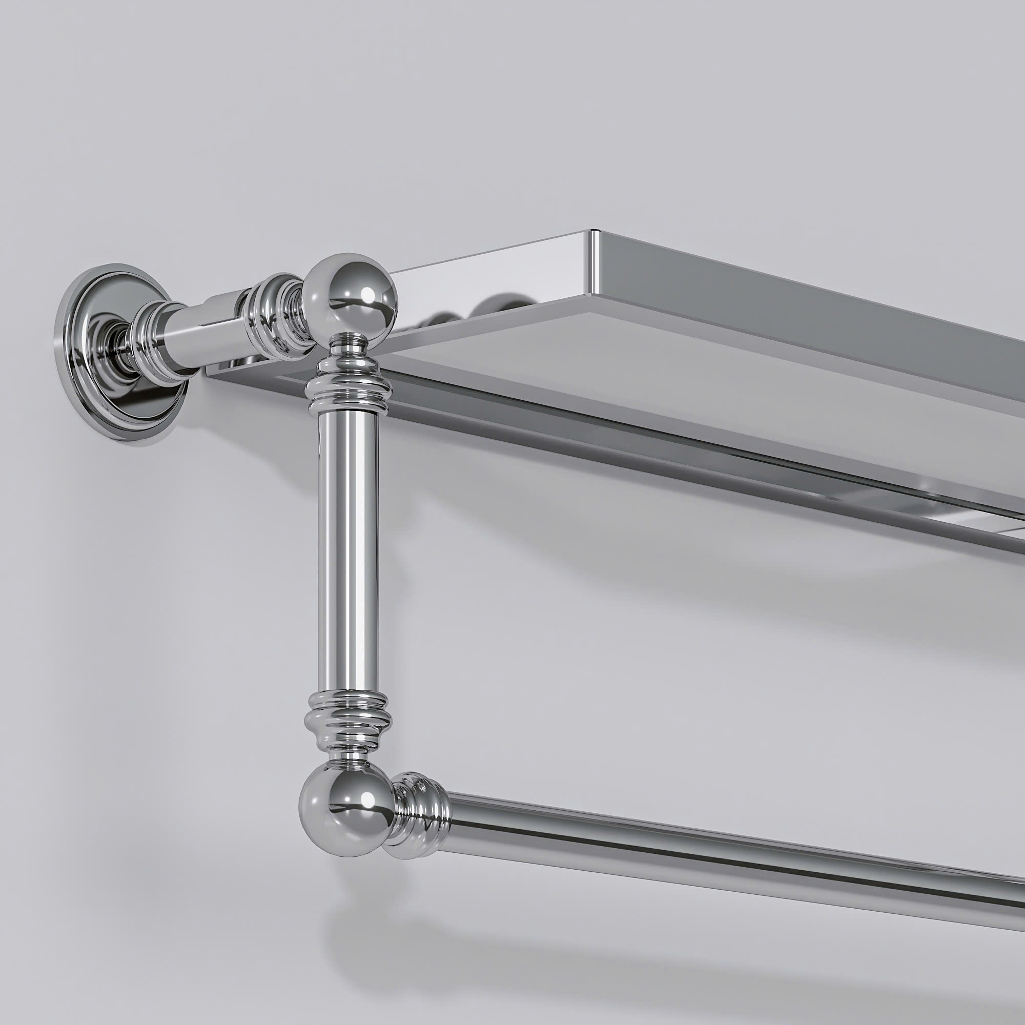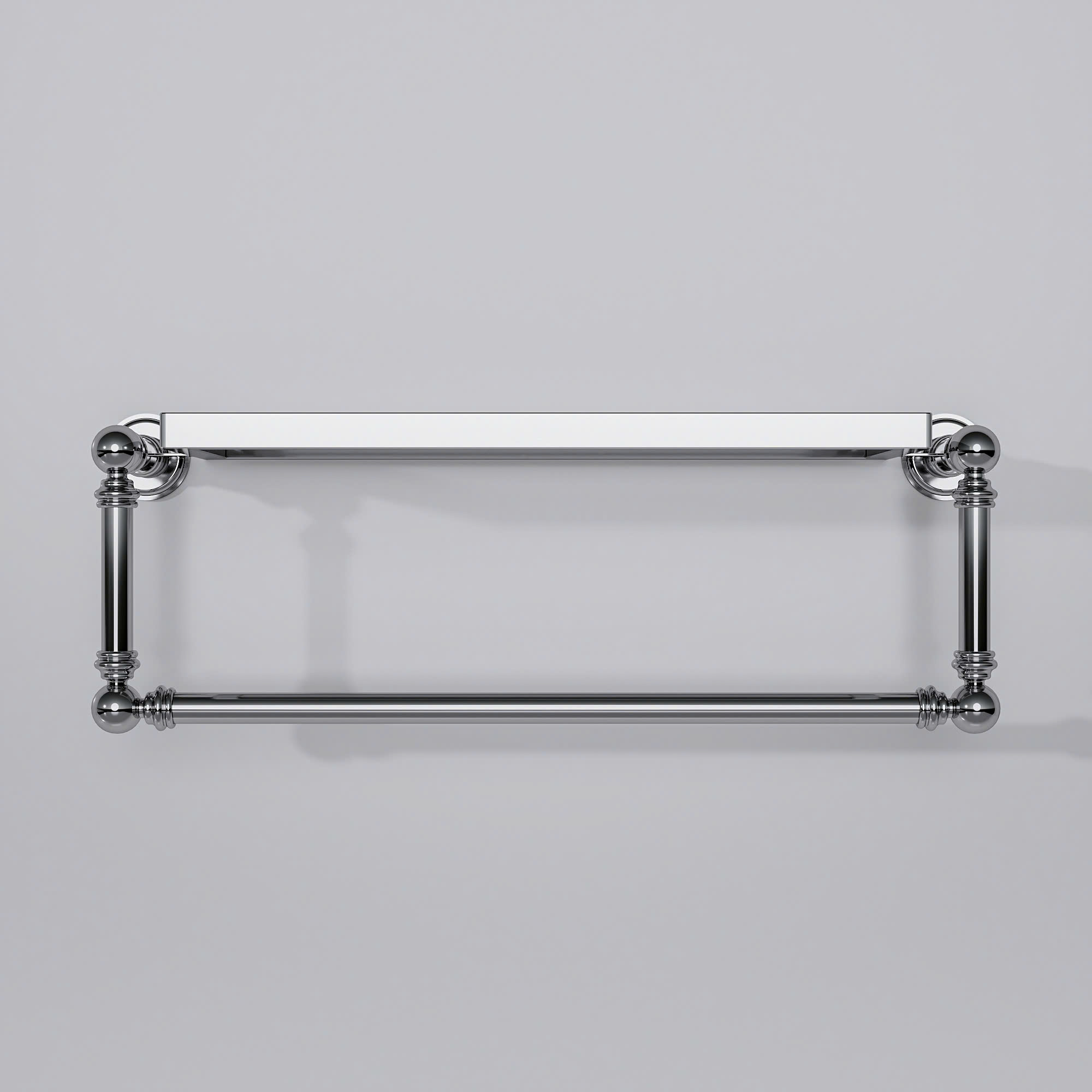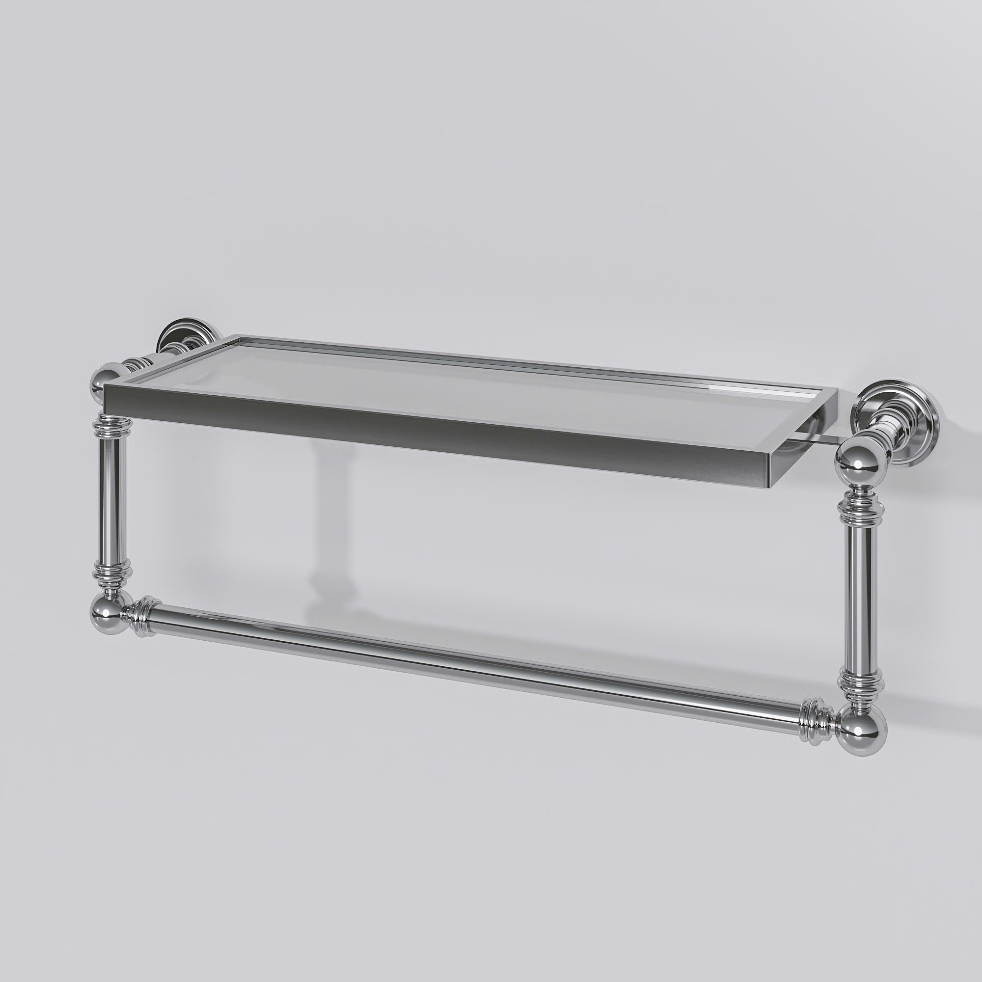 Kệ treo khăn gắn tường với thiết kế gọn gàng và tiện dụng. Phần trên là mặt kệ phẳng để đặt đồ như chai lọ, mỹ phẩm hoặc vật dụng nhỏ. Bên dưới là thanh treo khăn giúp phơi hoặc treo khăn tắm, khăn tay rất thuận tiện. Kệ được làm từ kim loại sáng bóng, tạo cảm giác chắc chắn và bền bỉ, đồng thời mang lại vẻ hiện đại, sạch sẽ cho không gian phòng tắm. Thiết kế đơn giản nên dễ lắp đặt và phù hợp với nhiều kiểu nội thất khác nhau.