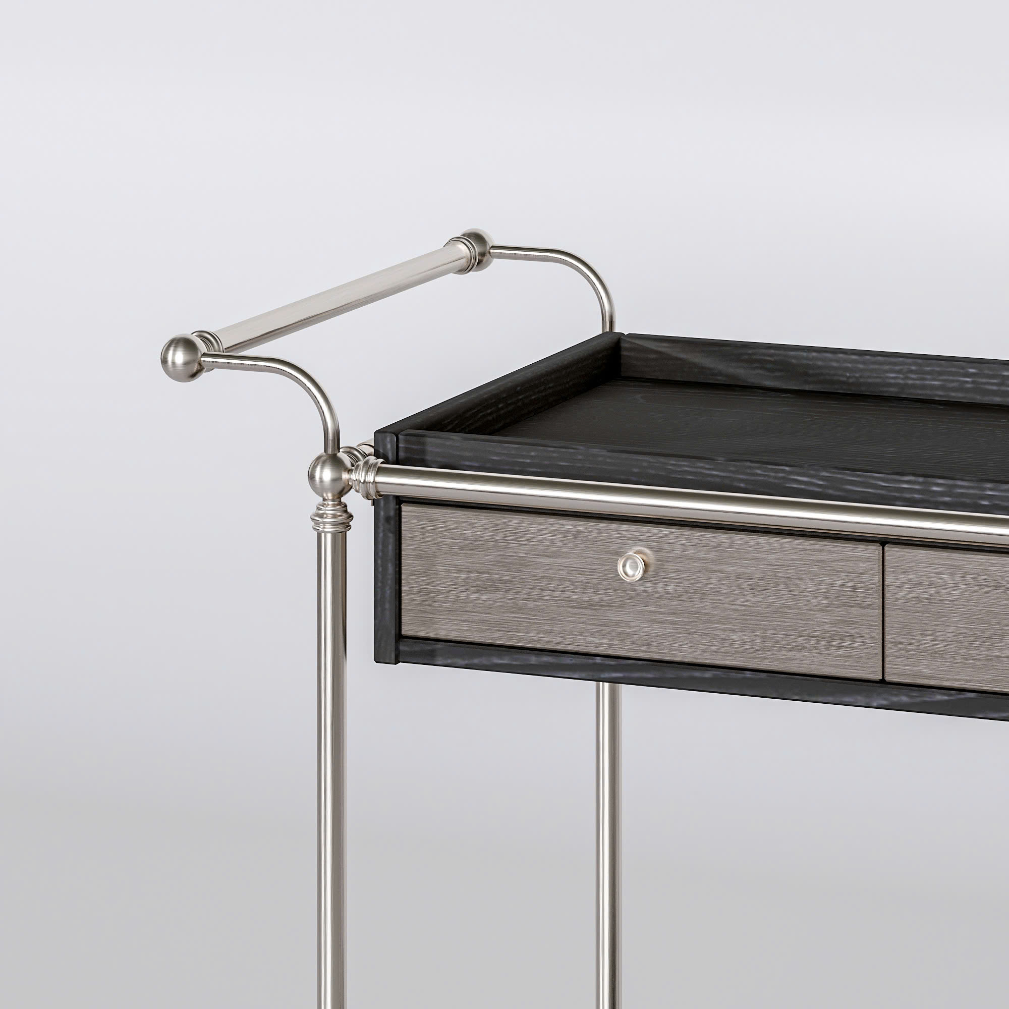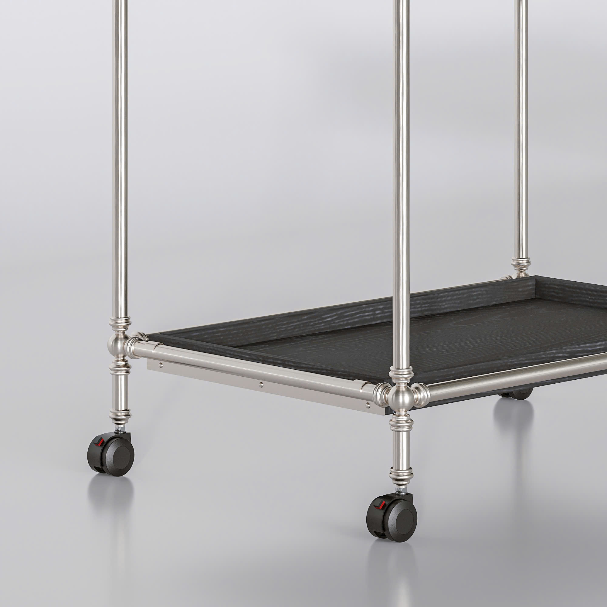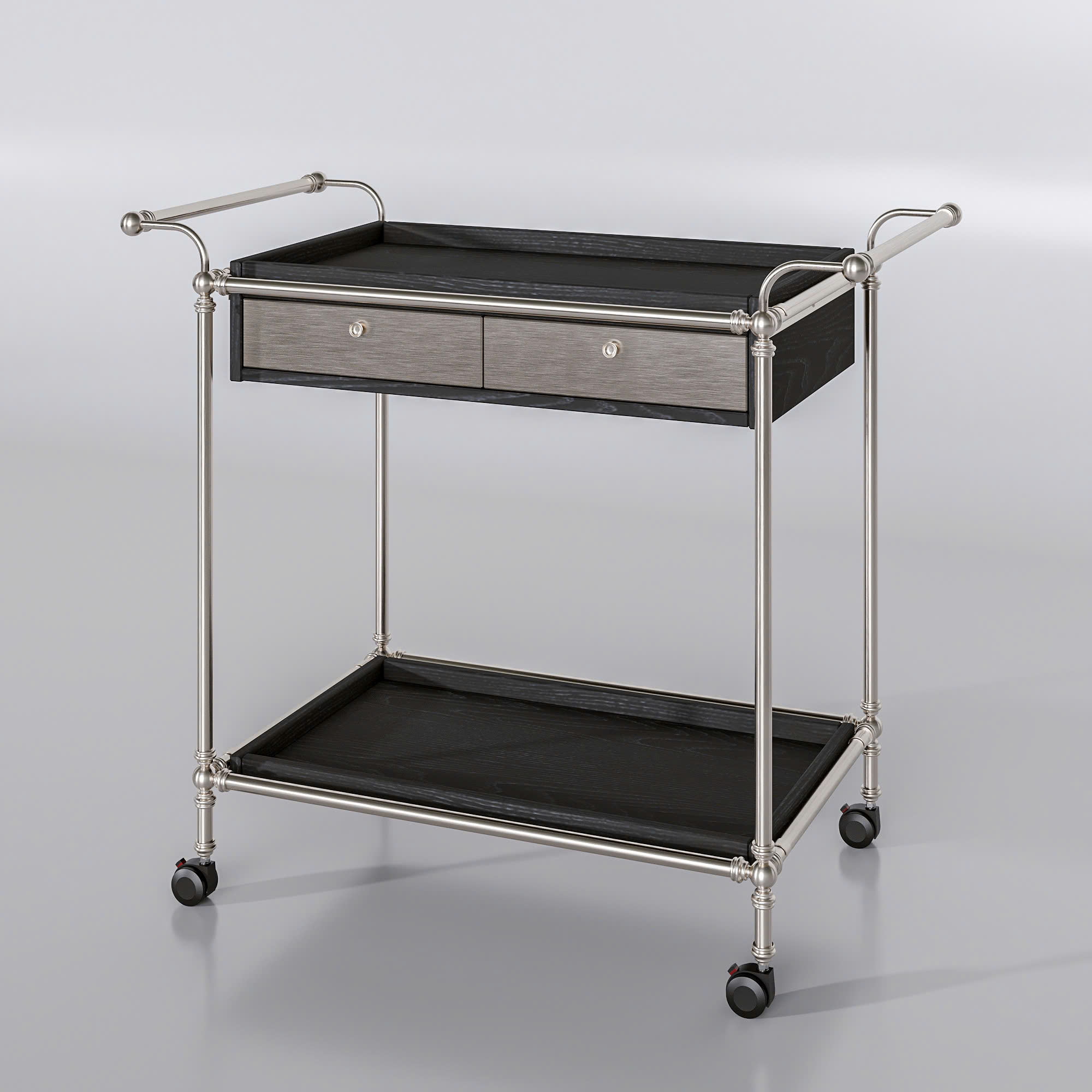 Đây là một chiếc xe đẩy đa năng với thiết kế hiện đại và chắc chắn. Khung xe làm từ kim loại sáng, kết hợp với các mặt kệ bằng gỗ màu tối tạo điểm nhấn sang trọng.